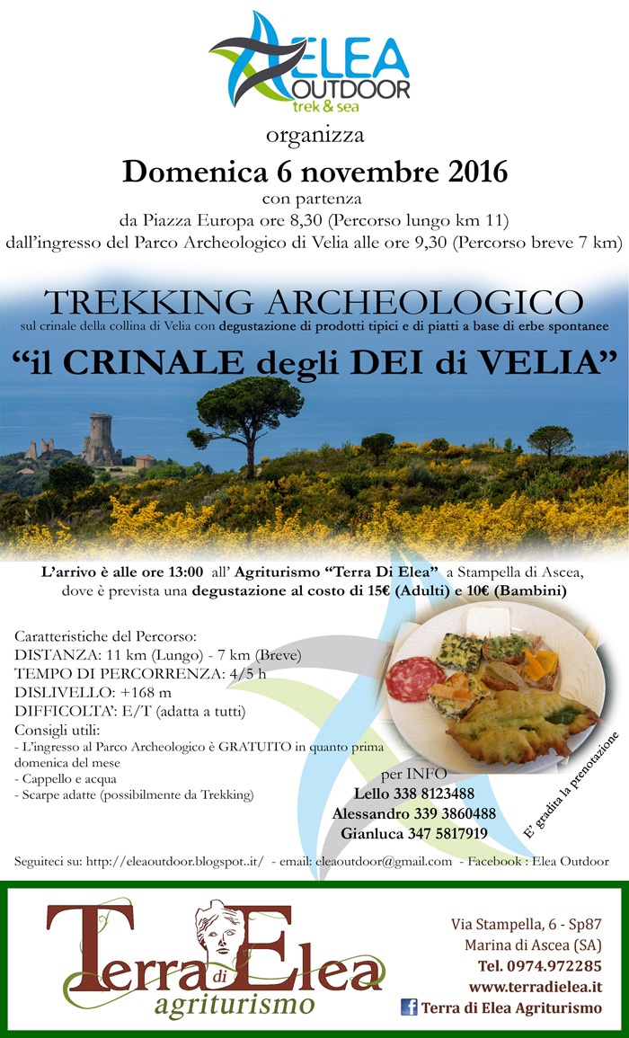 A termine della visita classica di Velia, sull’Acropoli si imboccherà il sentiero che ci porterà a percorrere tutto in Crinale degli Dei. A metàdel Crinale degli Dei, che lungo più di 1 Km, si raggiungerà il punto piùalto e panoramico (148 m. s.l.d.m. ). Il crinale oltre che dal punto di vista Archeologico è molto interessante anche dal punto di vista Naturalistico, infatti l’escursionista verrà guidato al riconoscimento di piante tipiche della macchia mediterranea che qui è molto rigogliosa.