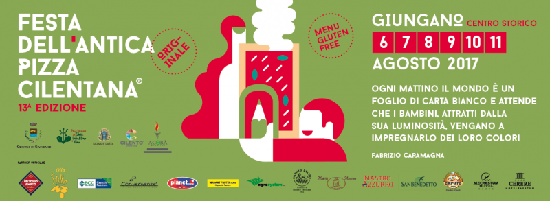 L'Associazione Cilentum Pizza vi invita alla 13° Edizione della Festa Dell'Antica Pizza Cilentana, che si svolge come ogni anno fra le strade del Centro Storico di Giungano (SA). Le date interessate dalla sagra sono le seguenti: 6-7-8-9-10-11 Agosto 2017.