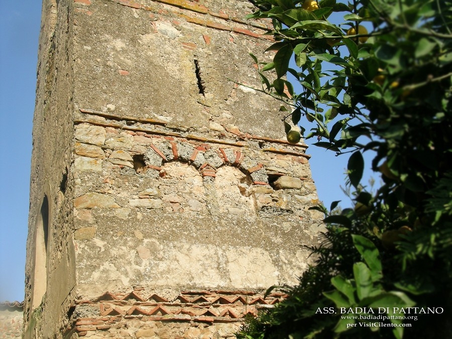 La torre campanaria di Pattano si configura tra le più antiche e suggestive dell'Italia Meridionale per l'alto medioevo. A pianta quadrata, la struttura si erge per un'altezza attuale di poco più di 15 metri. La torre è costituita di 5 ordini decorativi, che fanno pensare ad altrettante fasi costruttive. In ogni caso, la varietà delle decorazioni, sia sulle finestre (bifore costolonate, con cornici) sia sulle cornici di demarcazione dei vari livelli, rende la torre dinamica ed estremamente interessante da un punto di vista artistico. Se la torre di Pattano serviva a dimostrare l'importanza ed il potere raggiunto dal monastero nella zona, aveva probabilmente anche una funzione religiosa. È stato ipotizzato, infatti, che la stanzetta presente al livello basso della torre ospitasse il semantron, uno strumento di legno o bronzo che serviva a scandire le ore di preghiera e di lavoro dei monaci, quando ancora le campane non erano divenute di uso corrente.